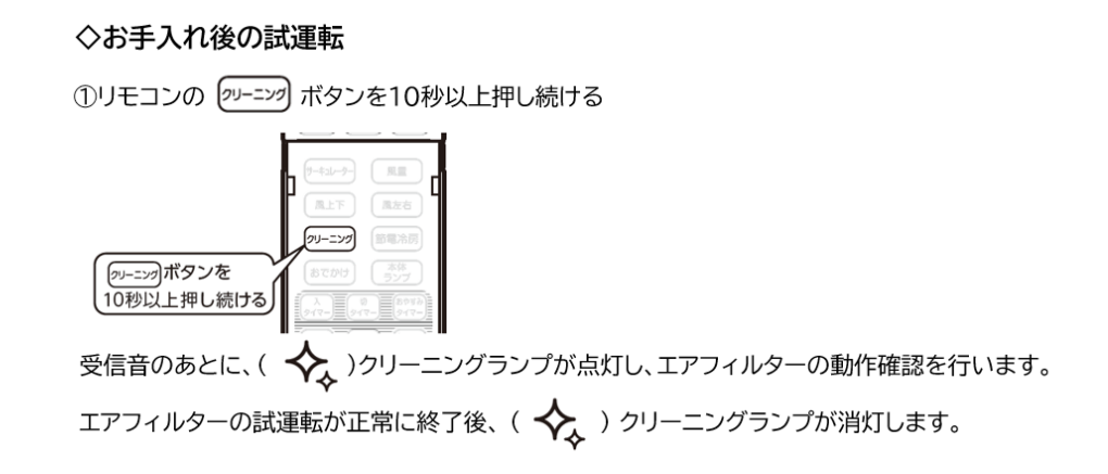 - その後に「お手入れ後の試運転」のため「おそうじボタンを10秒以上長押し」を忘れずに
